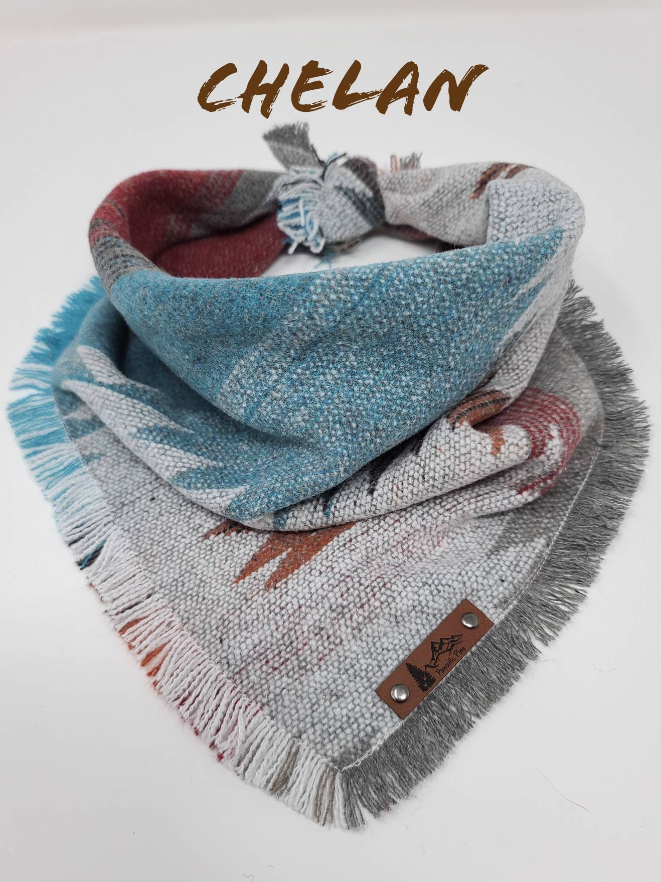 The "Chelan" bandana is an Aztec design in Blue, White and Brown aztec print. This thick aztec bandana has frayed edges on two sides, Double stitched for extra durability and has an attached vegan leather tag. This is a single layer triangle tie on style bandana that can be folded down for different looks.