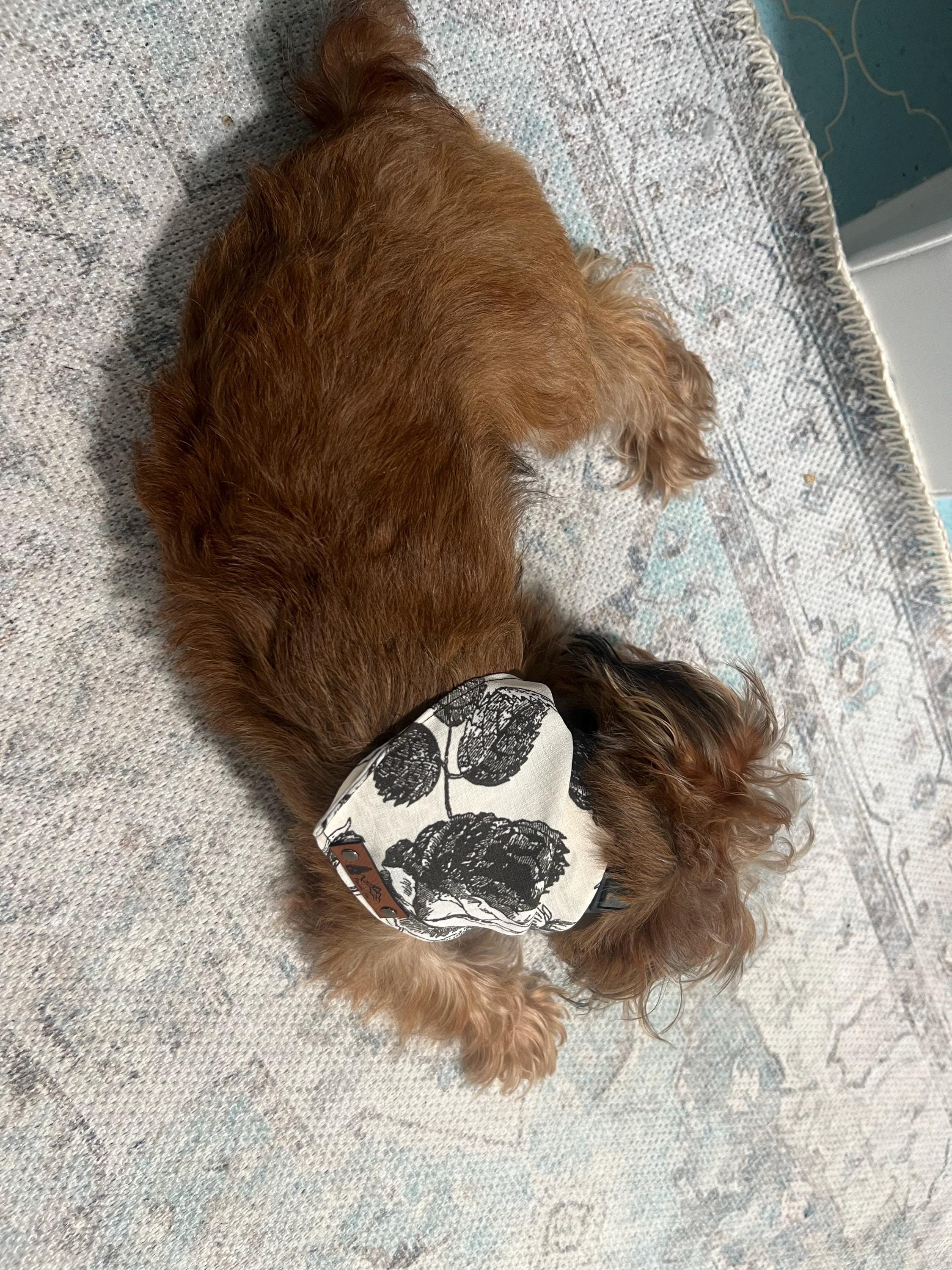 The "Denmark" bandana is a beautiful rayon blend bandana in cream and black floral. This lightweight bandana has rolled hemmed edges on all four sides and has an attached vegan leather tag. This is a square bandana folded in half tie on style that can be folded in many ways for different variety of looks. Made from cotton/viscose preshrunk fabric. Hand washing in cool water and laying flat to dry is recommended. Iron as needed.