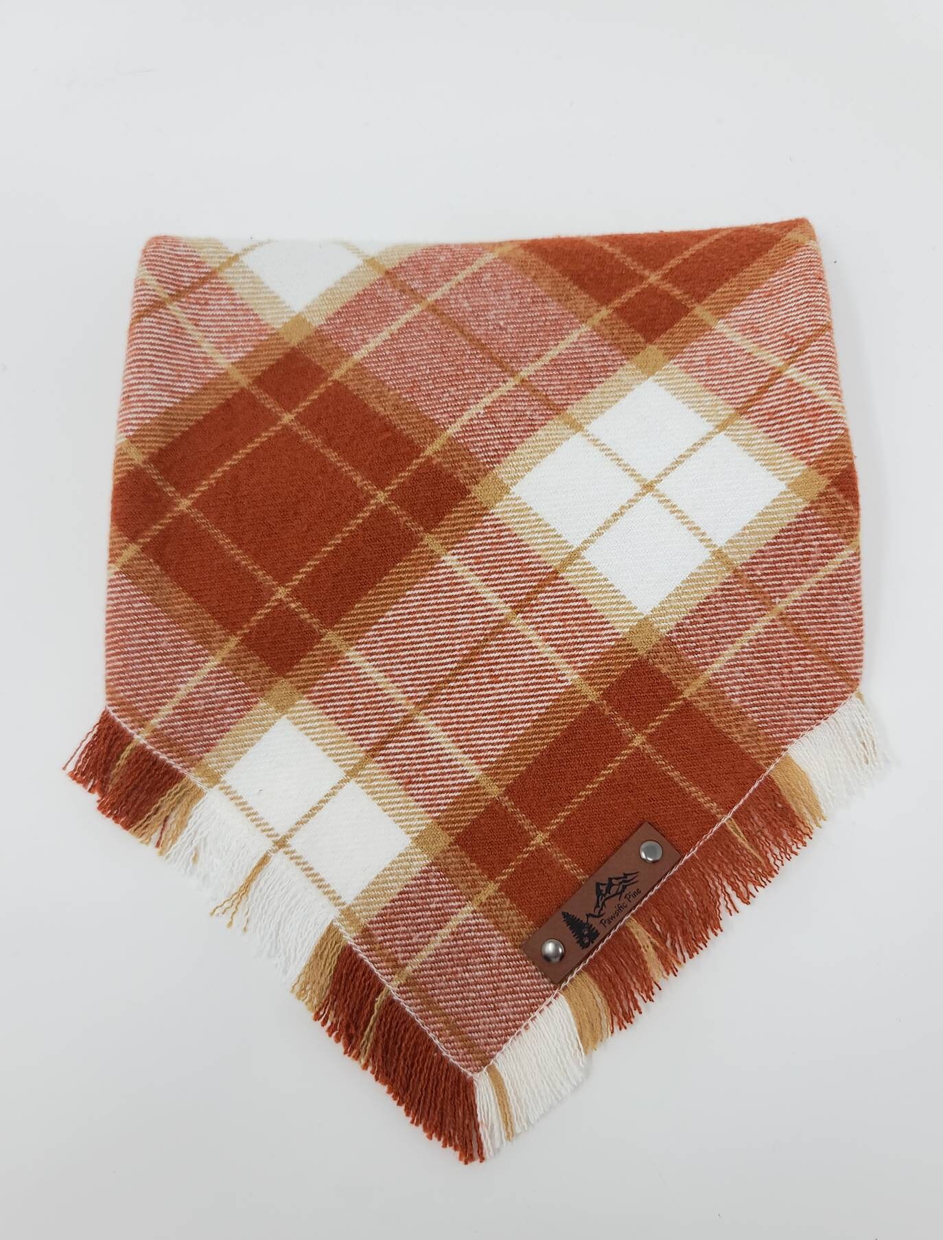 The "Ouray" plaid bandana is a Orange and White plaid flannel with frayed edges on two sides. Double stitched for extra durability and an attached vegan leather tag. This is a single layer triangle tie on style bandana that can be folded down for different looks. Made from 100% preshrunk cotton. Hand washing in warm water and laying flat to dry is recommended. Iron as needed and gently use a soft brush or comb to straighten out the fringe after its dry if desired