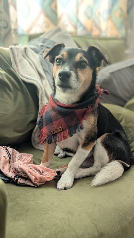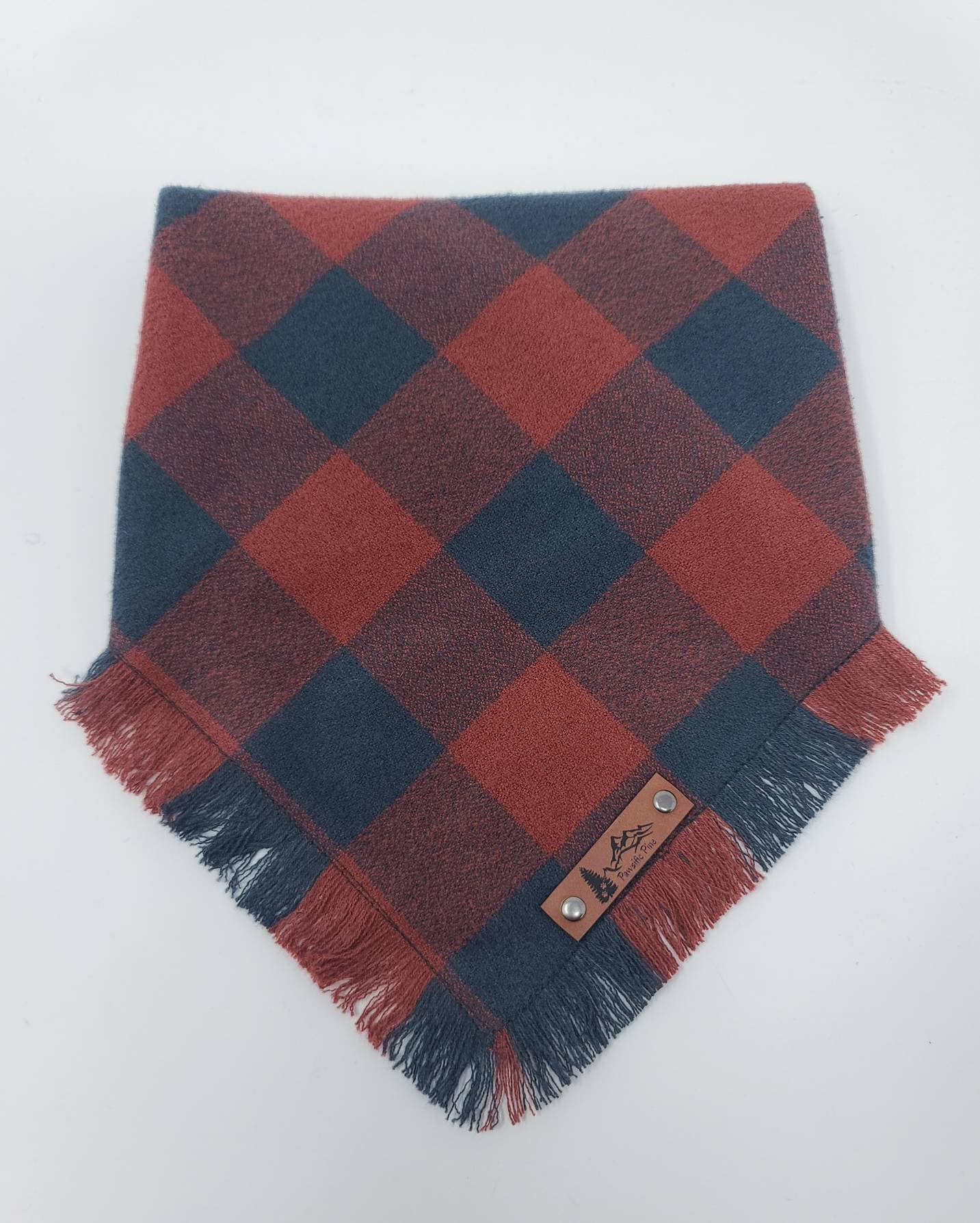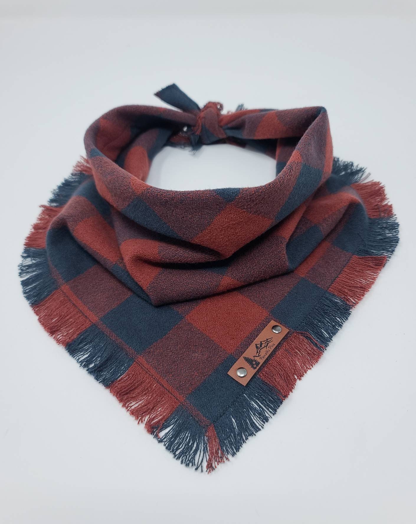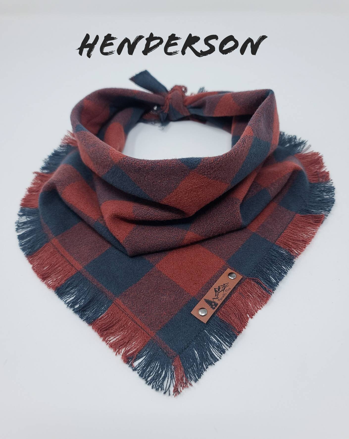 The "Henderson" Dog bandana is a Brick Redand Black plaid flannel with frayed edges on two sides. Double stitched for extra durability and an attached vegan leather tag. This is a single layer triangle tie on style bandana that can be folded down for different looks. Made from 100% preshrunk cotton. Hand washing in warm water and laying flat to dry is recommended. Iron as needed and gently use a soft brush or comb to straighten out the fringe after its dry if desired