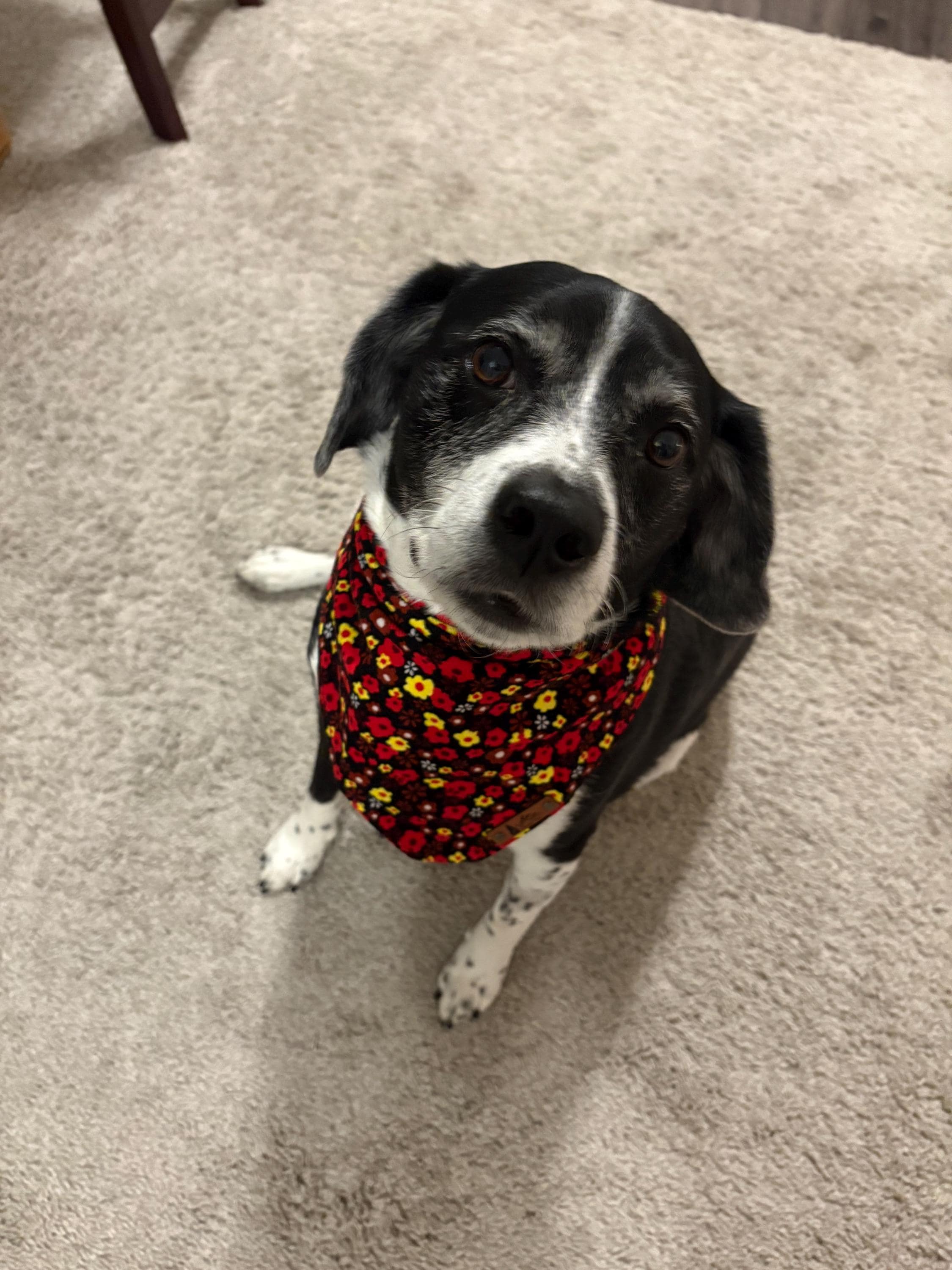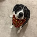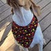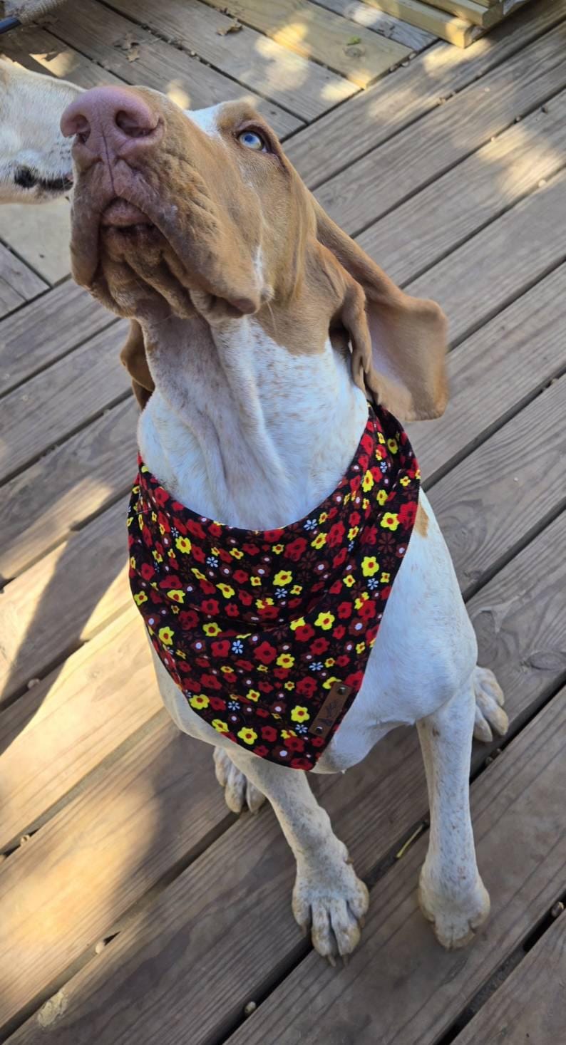 The "Monarch" bandana is a beautiful micro corduroy cotton floral bandana in black, red and yellow. This midweight bandana has rolled hemmed edges on all four sides and has an attached vegan leather tag. This is a square bandana folded in half tie-on style that can be folded in many ways for different variety of looks. This style of bandana fits best when folded down at the top.