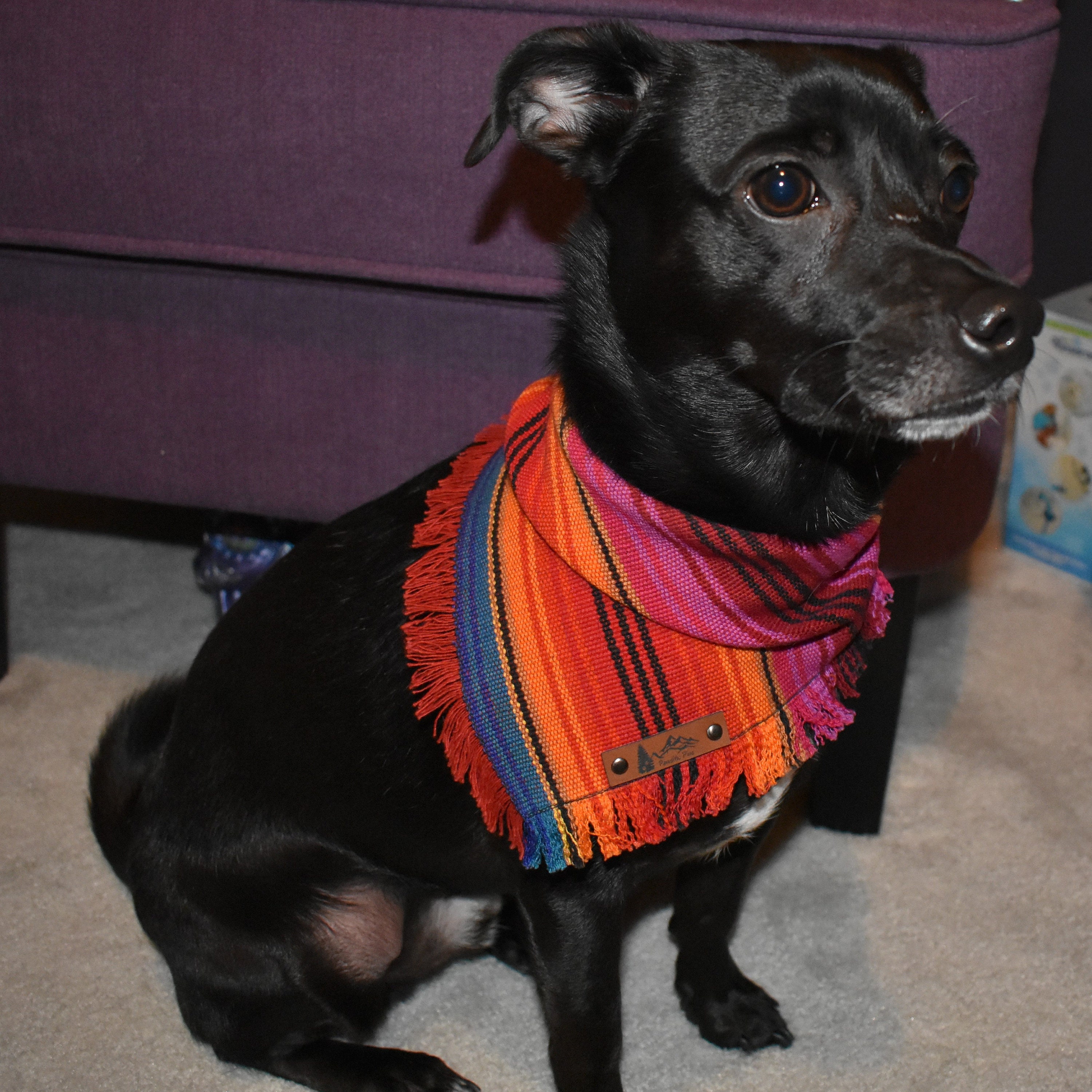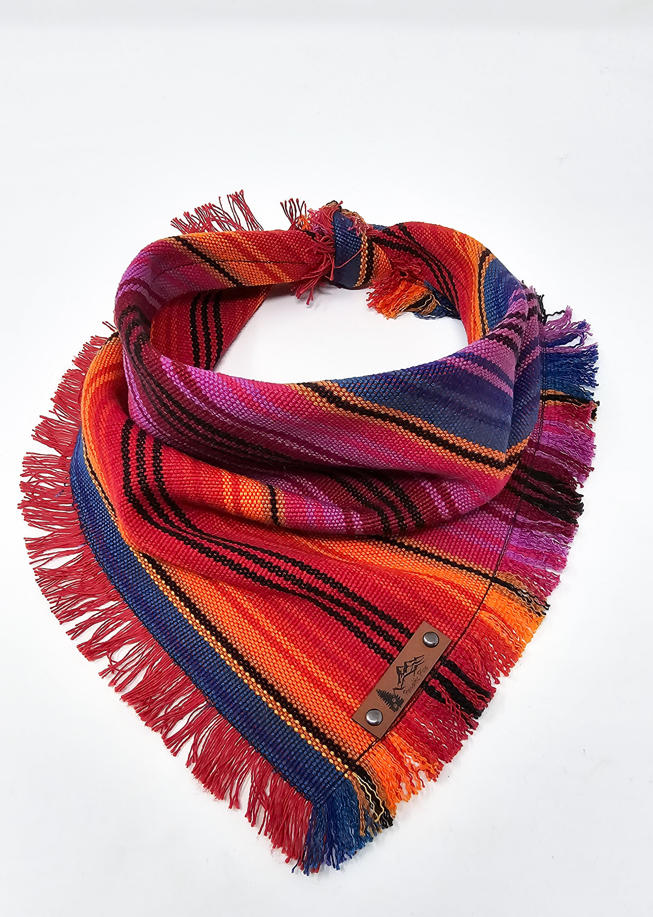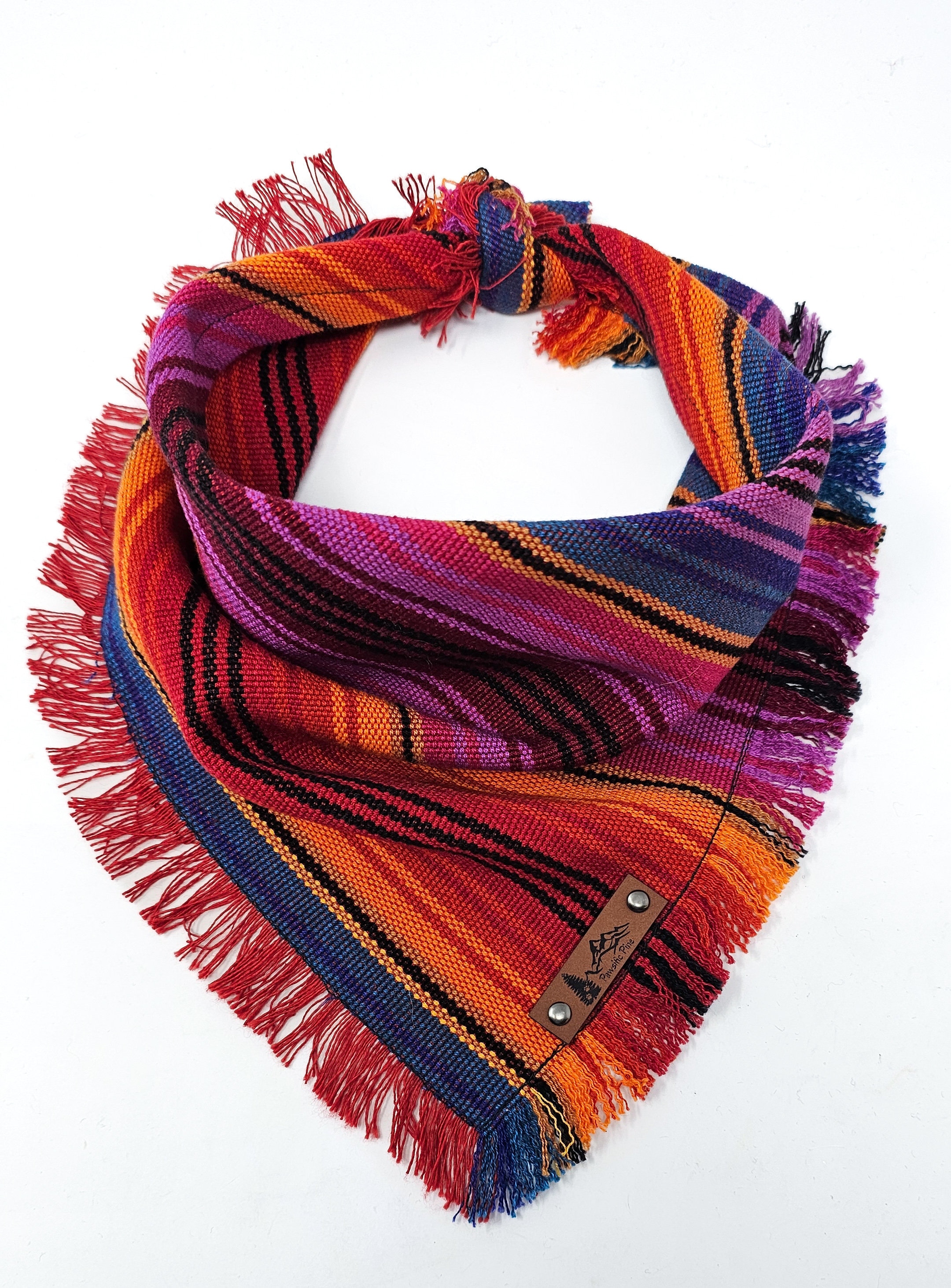 The "Painted Hills" Authentic Guatemalan Cotton bandana is a vibrant and colorful accessory. It features frayed edges on two sides, adding a touch of uniqueness. The bandana is double stitched for extra durability and has an attached vegan leather tag. It is a single layer triangle tie-on style bandana, which can be folded down to create different looks. We've added a snap at the ends for extra security to keep the knot in place and to give you options on single or double knot.