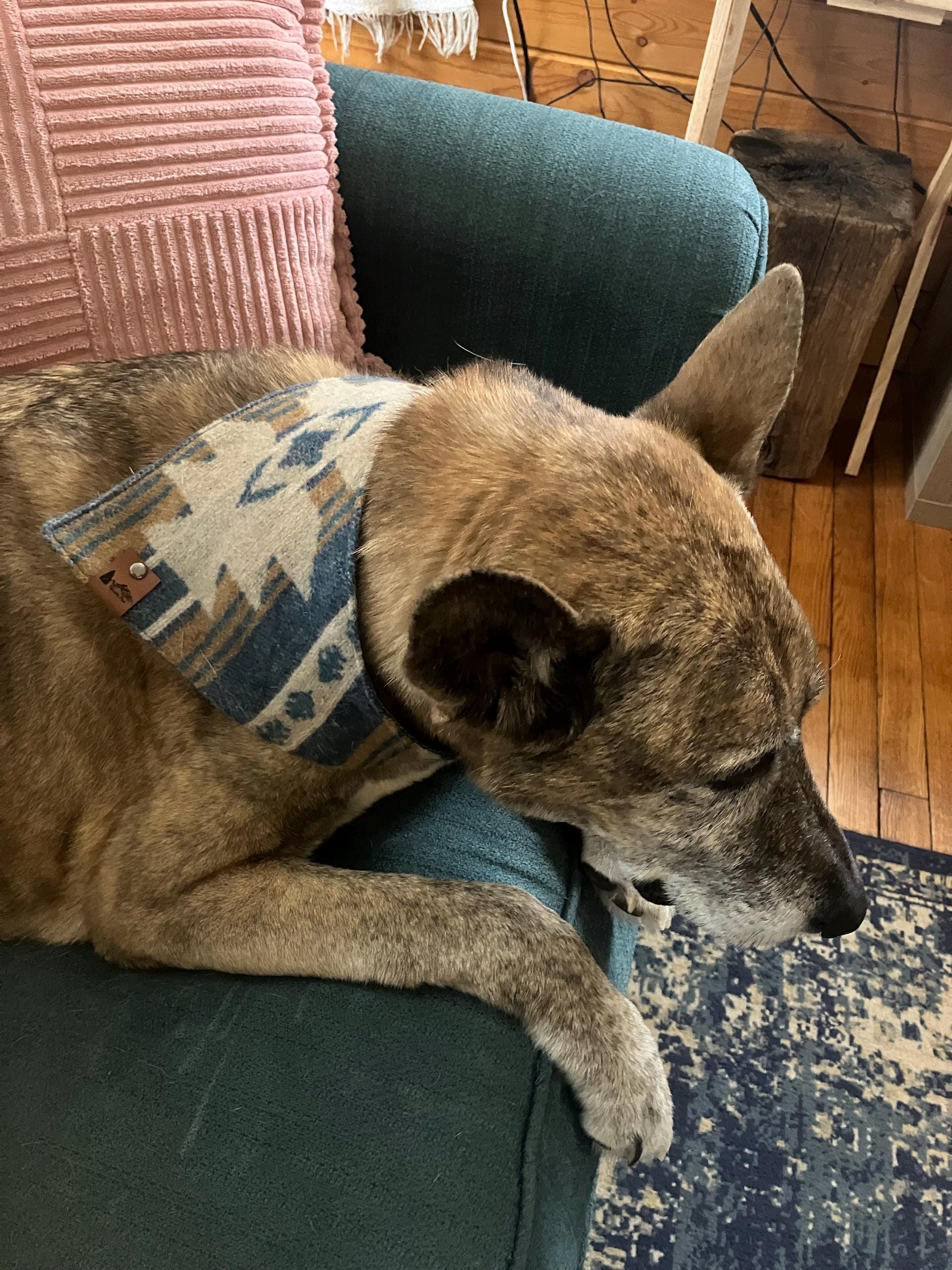 》The "Ozark" Dog bandana is a snap on style wool Aztec bandana. The bandana is lined with soft flannel and has two snaps in the back. Attach the bandana by using both snaps or just one on the outside one on the inside to make the fit looser or tighter.