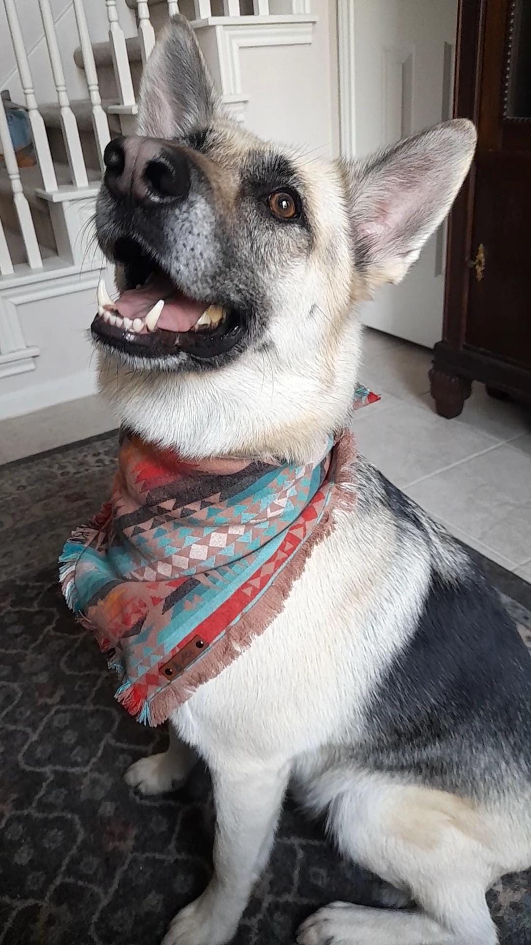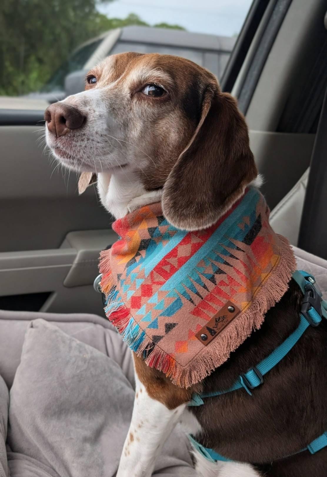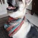 The "Terra" Dog bandana is a Aztec pattern in a Clay color with blue and red accents. it's 100% soft luxurious mid weight cotton with frayed edges on two sides. Double stitched for extra durability and an attached vegan leather tag. This is a single layer triangle tie on style bandana that can be folded down for different looks. Optional snaps on the ends for added security for the knot are available. Made from 100% preshrunk heavy cotton. Hand washing in warm water and laying flat to dry is recommended. Iron as needed and gently use a soft brush or comb to straighten out the fringe after its dry if desired
