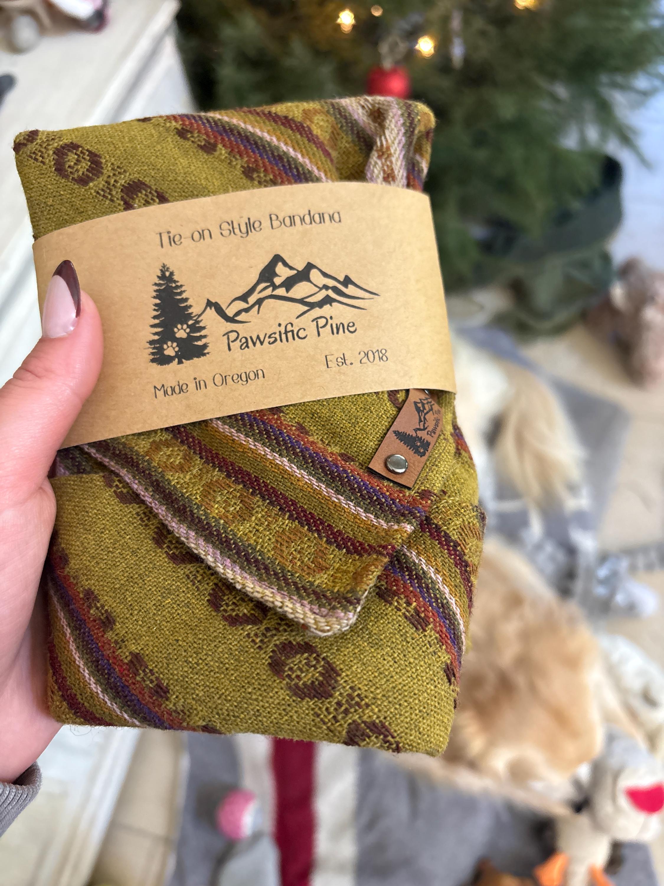 Introducing the Italian BoHo collection. "Vercelli" Pet bandana, made from a unique design of Green and Brown Italian Wool. This exquisite bandana features a folded and sewn triangle tie-on style, designed to ensure the perfect fit for your furry friend. With a snap attached at each end, you can securely fasten the bandana after knotting it, ensuring it stays in place throughout your adventures. You also have the option to tie it once and snap, or a double knot and snap.