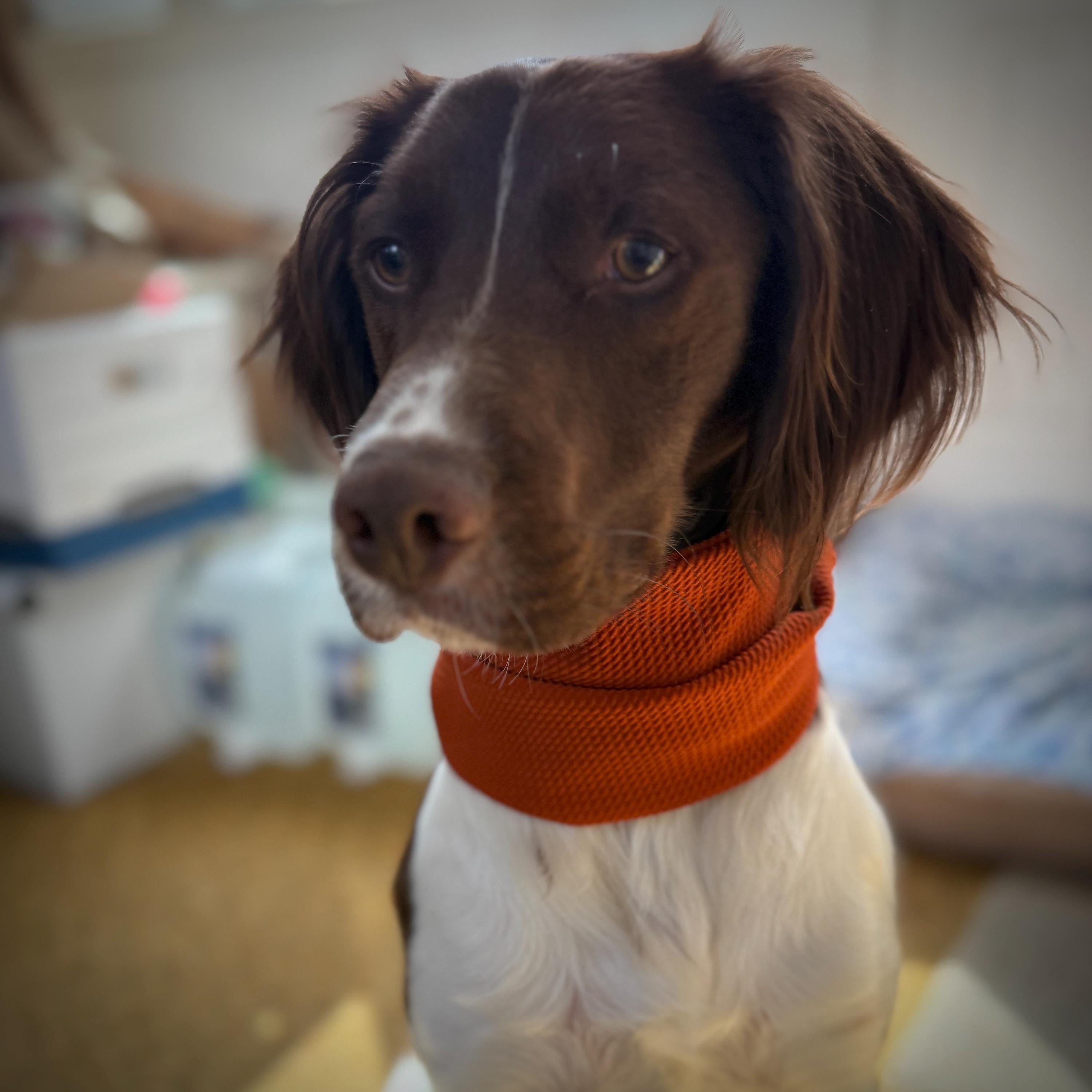 This scarf looks best on pups with short hair and lean necks. Each scarf is hand made to order for your pup.