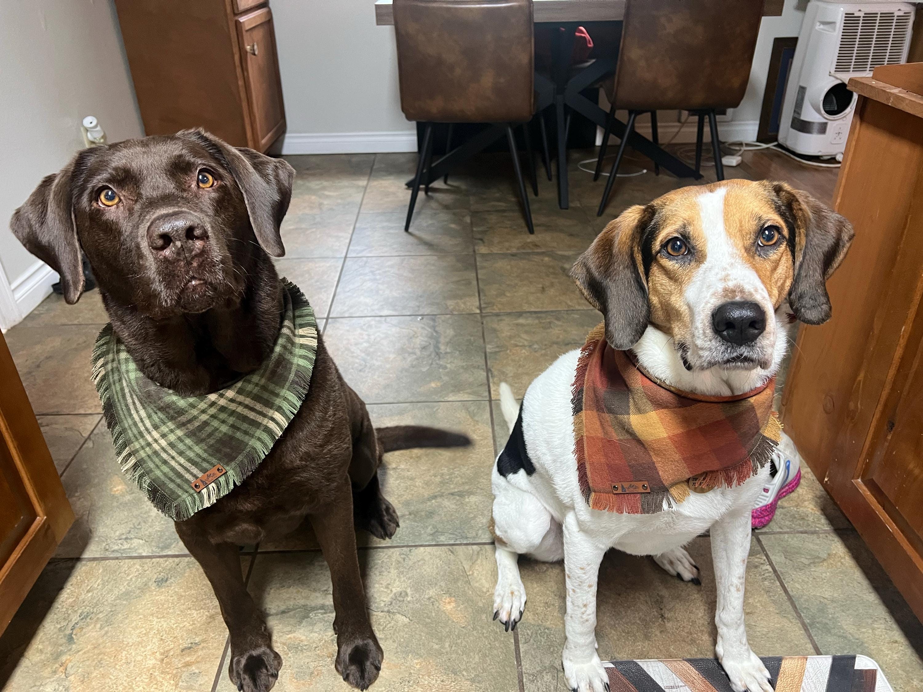 To enhance its elegance, we've added an attached vegan leather tag, showcasing our commitment to quality and animal-friendly materials. This single-layer triangle tie-on style bandana offers versatility, allowing you to fold it down for different looks, depending on your furry companion's style.