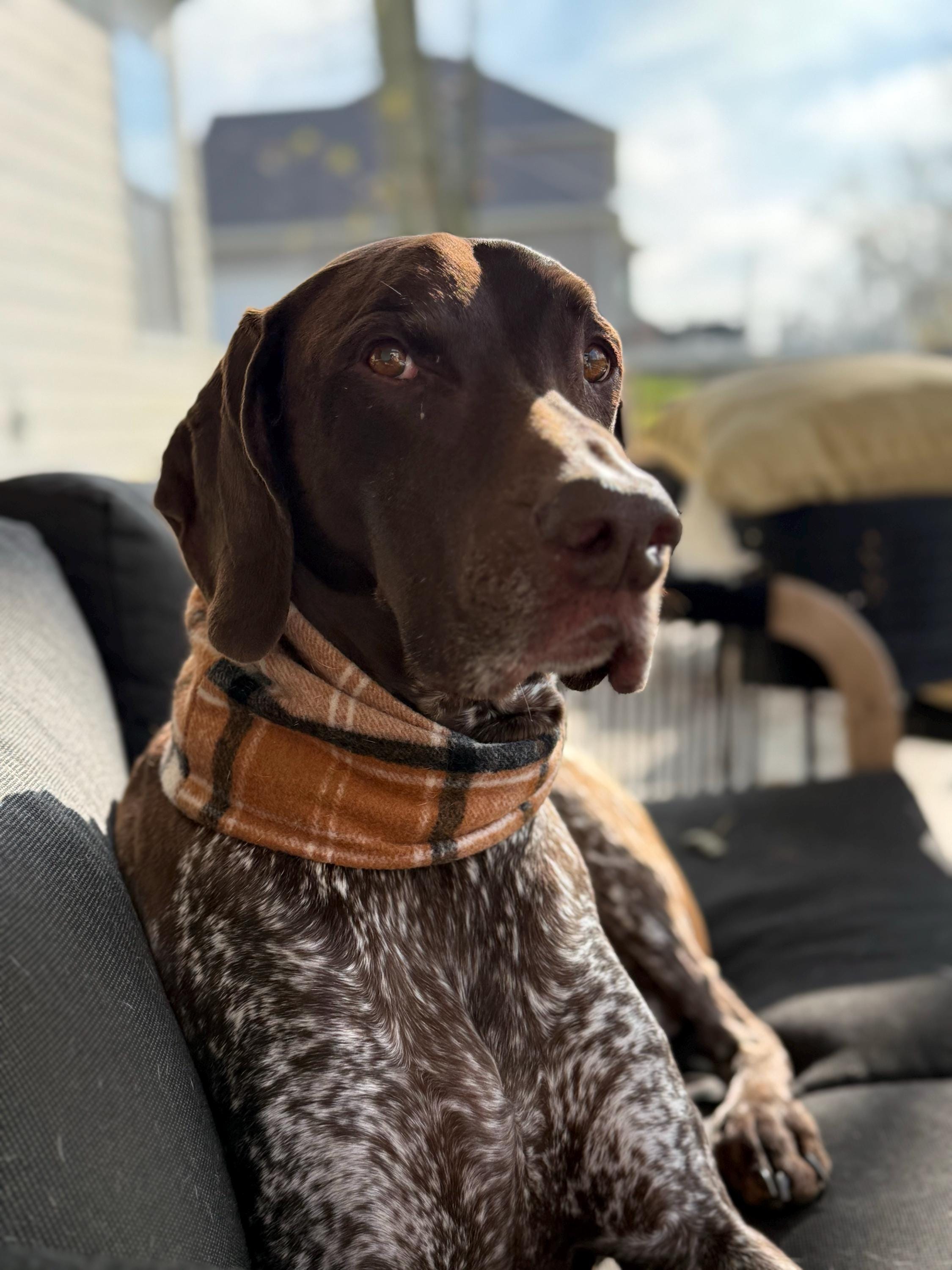 The "Tigard" scarf is particularly suited for dogs with short hair and lean necks, as it is designed to showcase their elegant features. Each scarf is handcrafted to order, allowing us to create a unique accessory tailored specifically for your pup.