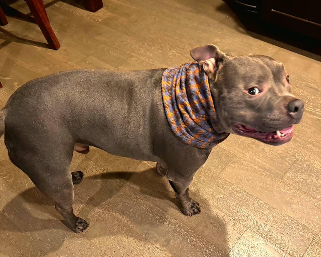 Thank you for your interest in our "Thacker" Twist infinity scarf! This stylish and cozy neckwear is designed as a pull-on style, ensuring a secure and comfortable fit for your furry friend. To ensure the best fit, we kindly request two measurements: the neck measurement and the measurement of the largest part of the head, especially if your pup has a larger head.