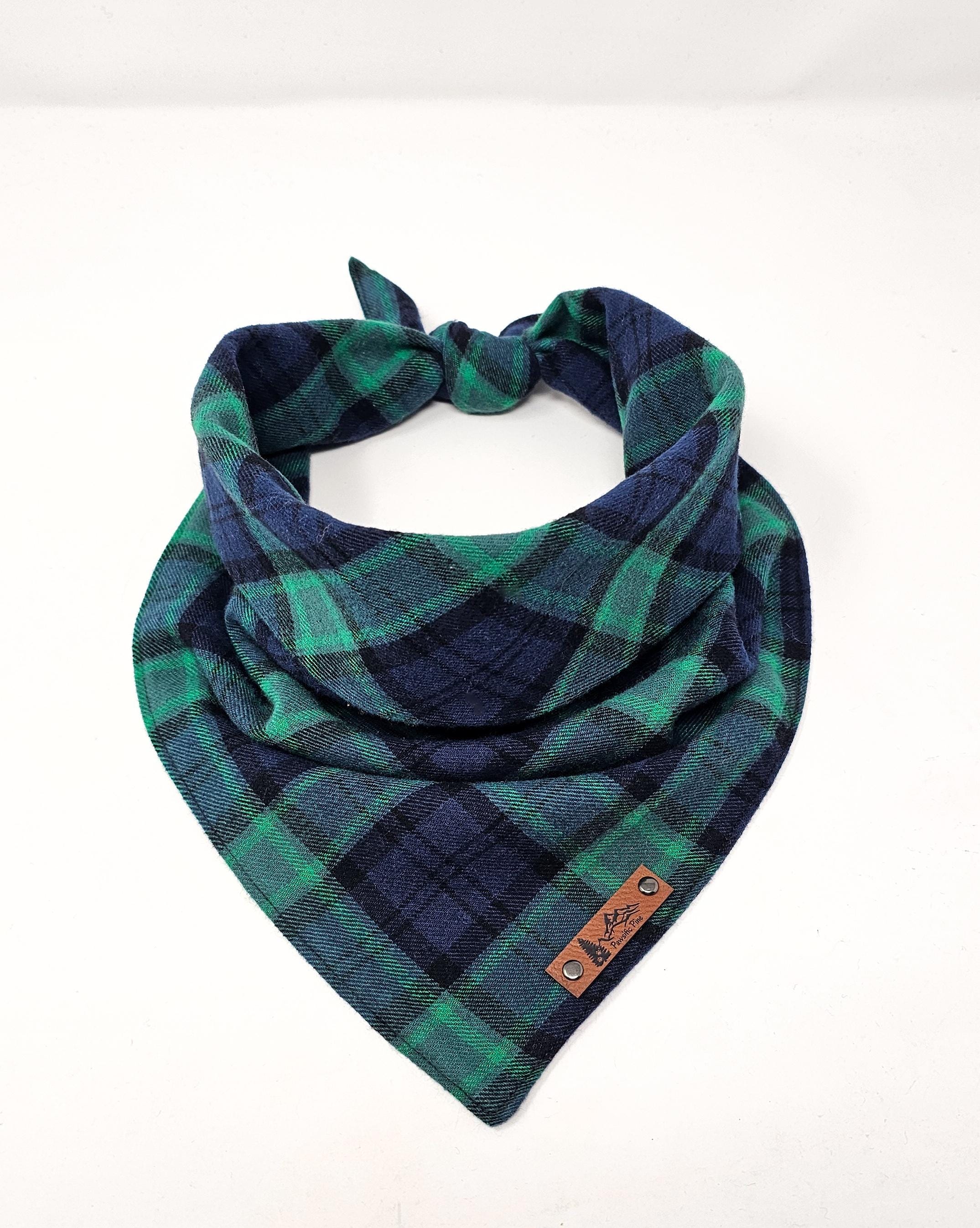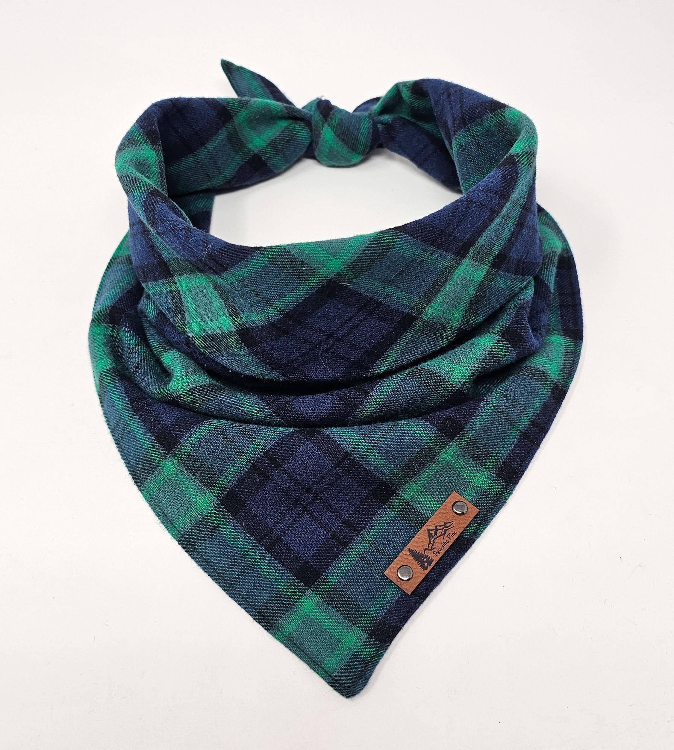 》The "Herlong" pet bandana is a Green and Navy Plaid cotton print. This a folded and sewn self lined triangle tie on style bandana. This bandana is meant to be be folded down for the best fit and look. Made from 100% preshrunk yarn dyed cotton. Hand washing in cool water and laying flat to dry is recommended. Iron as needed.