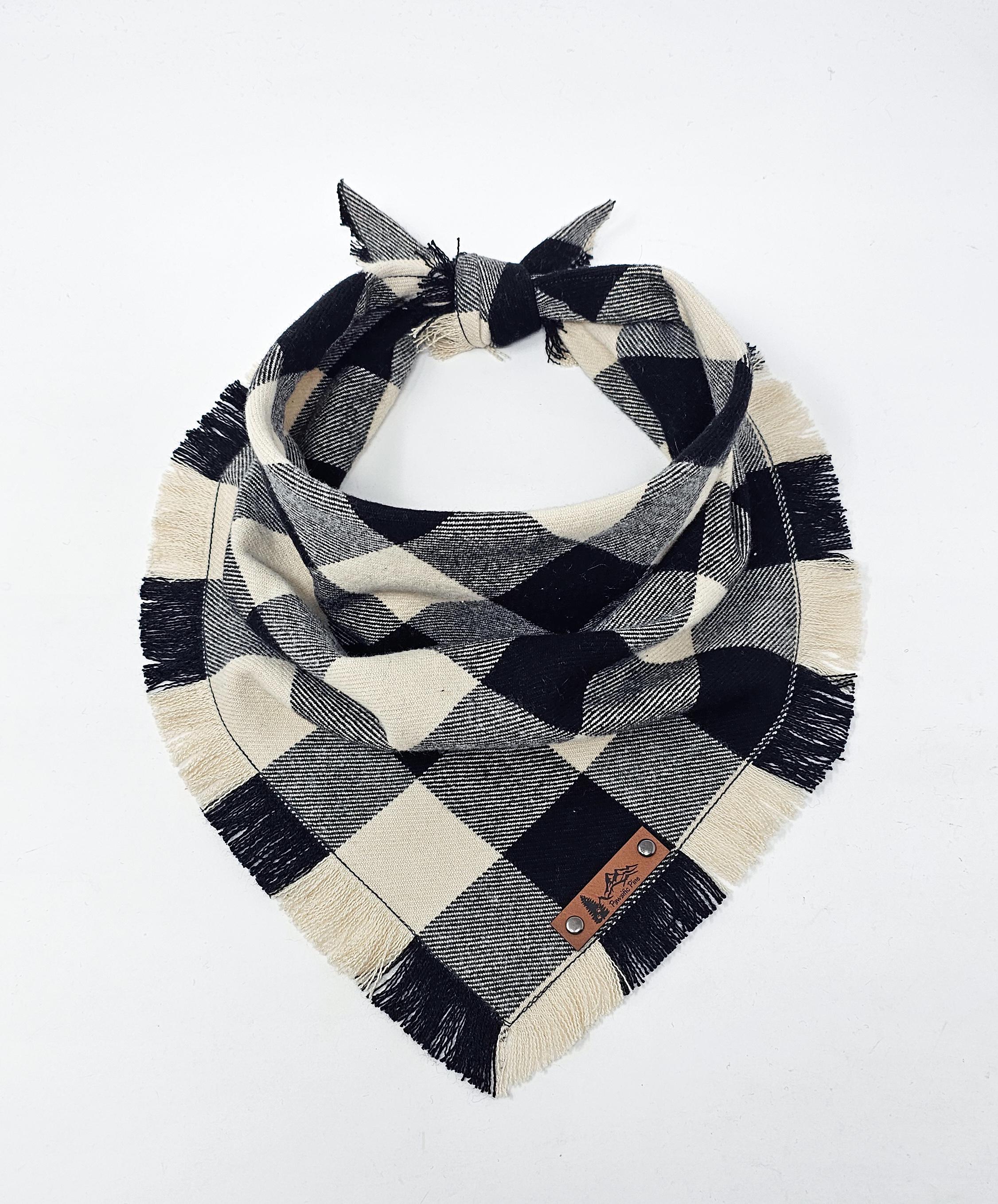 Introducing the stunning "Magalia" bandana, featuring a warm buffalo plaid design in black and cream. This eye-catching bandana is skillfully crafted from yarn dyed cotton, giving it a unique and stylish appeal. The frayed edges on two sides add a touch of rustic charm, while the double stitching ensures exceptional durability.