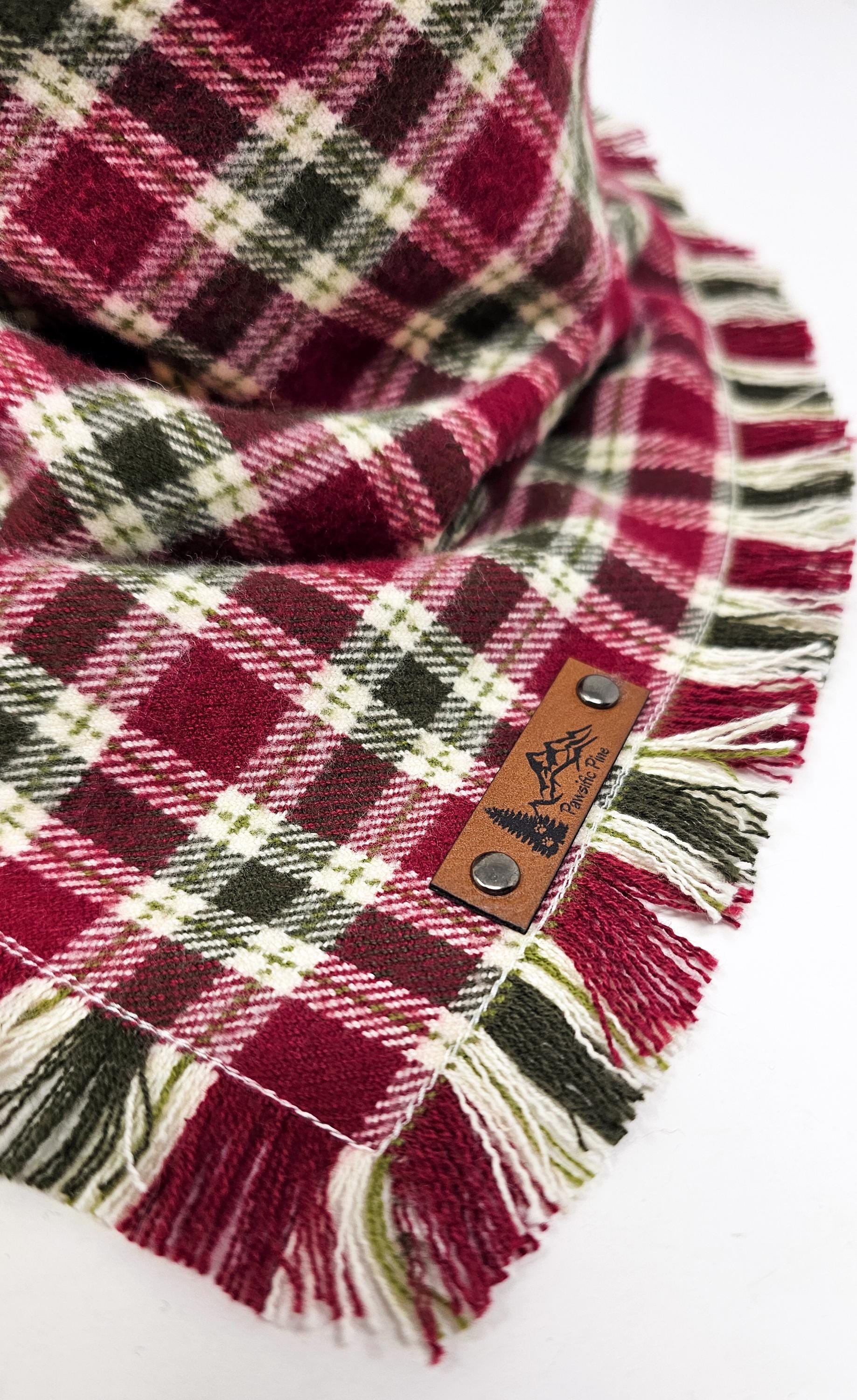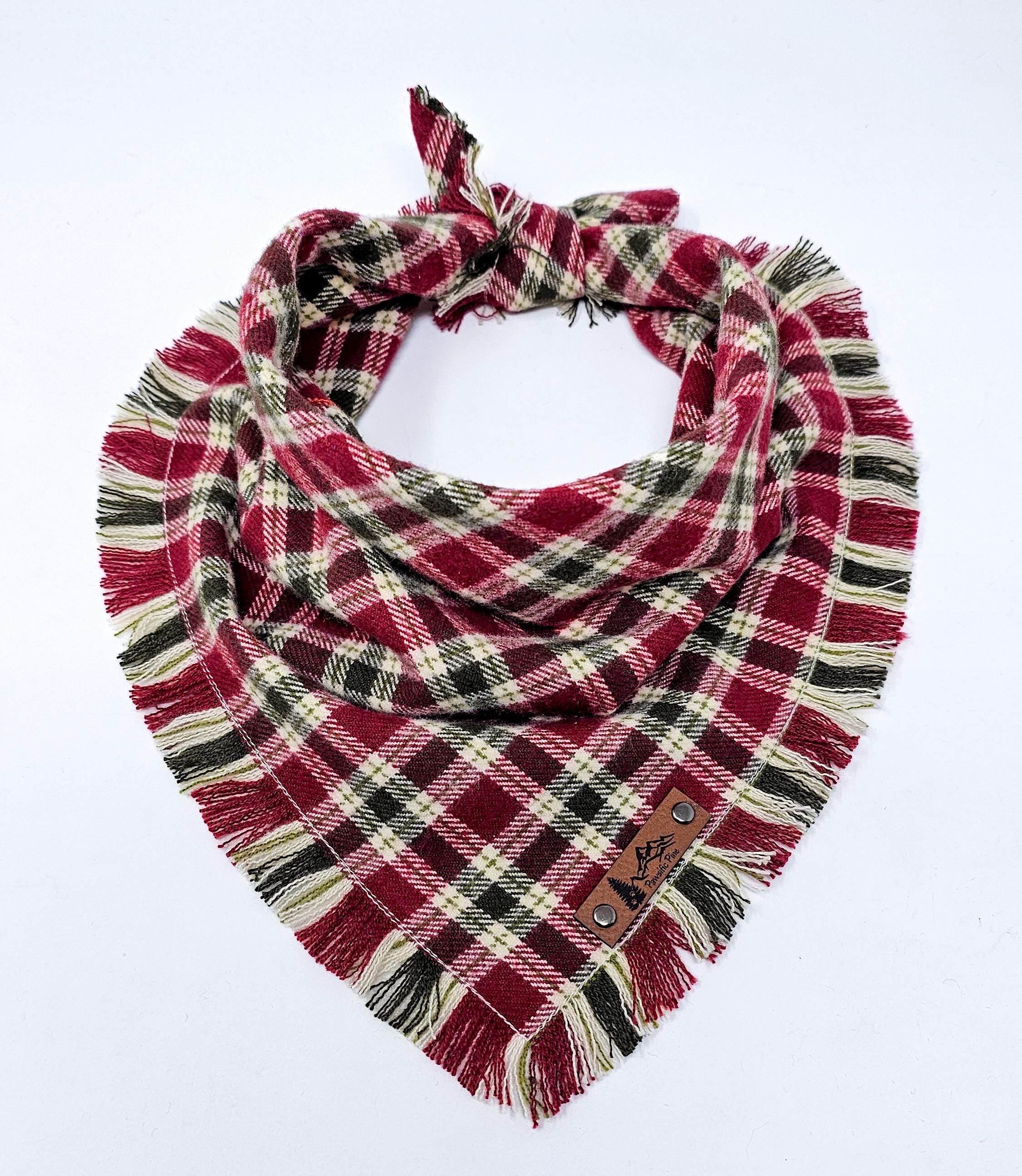 Introducing the stunning "Porter" bandana, featuring a warm plaid design in Red, Green, and Cream. This eye-catching bandana is skillfully crafted from yarn dyed cotton, giving it a unique and stylish appeal. The frayed edges on two sides add a touch of rustic charm, while the double stitching ensures exceptional durability.