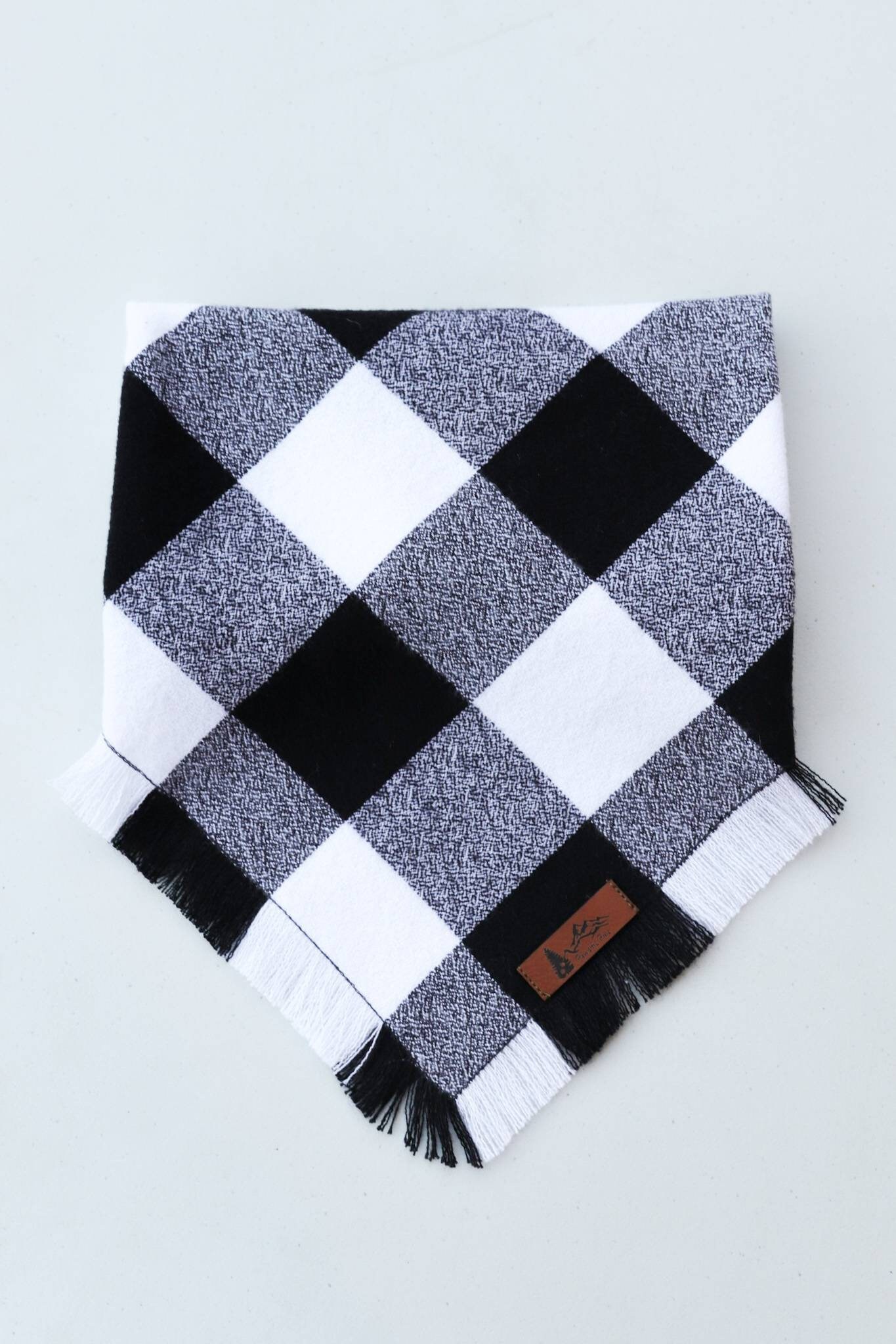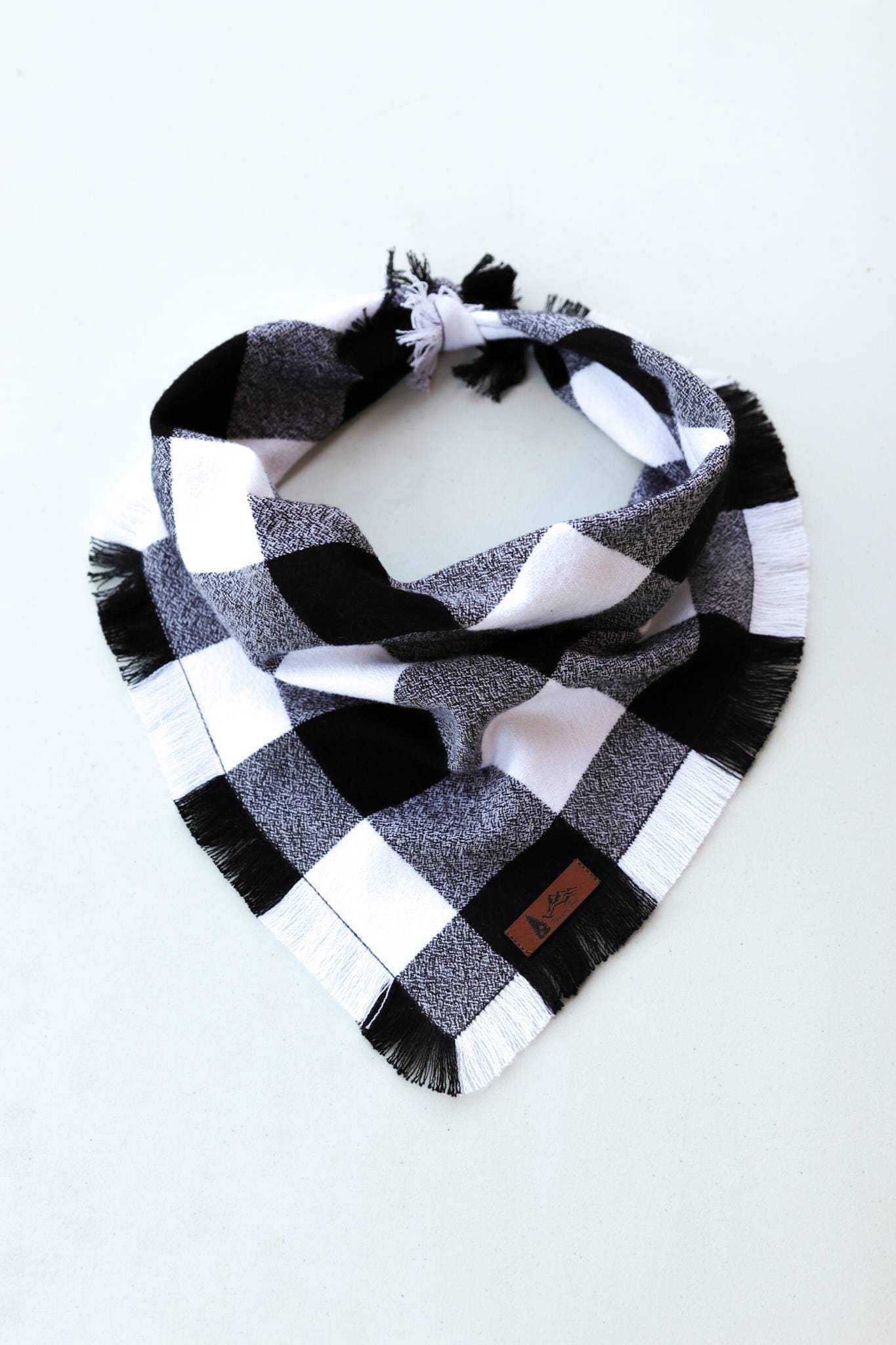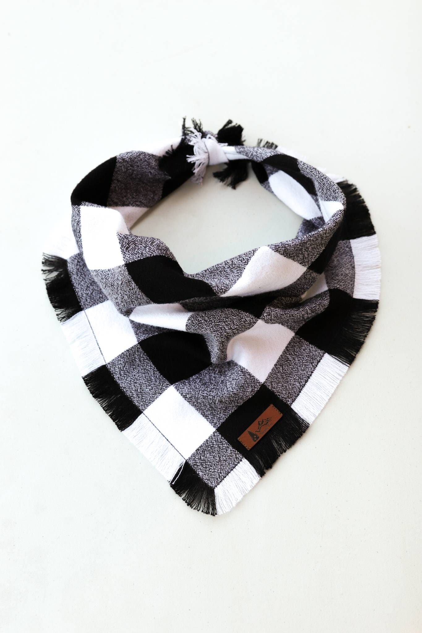 The "Ritzville" Dog bandana is a Black and White plaid flannel with frayed edges on two sides. Double stitched for extra durability and an attached vegan leather tag. This is a single layer triangle tie on style bandana that can be folded down for different looks. Made from 100% preshrunk cotton. Hand washing in warm water and laying flat to dry is recommended. Iron as needed and gently use a soft brush or comb to straighten out the fringe after its dry if desired