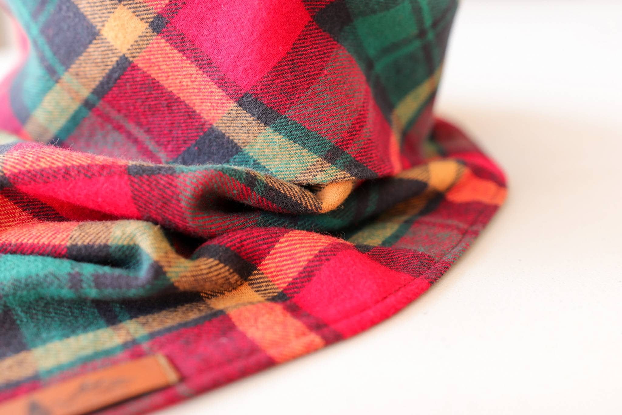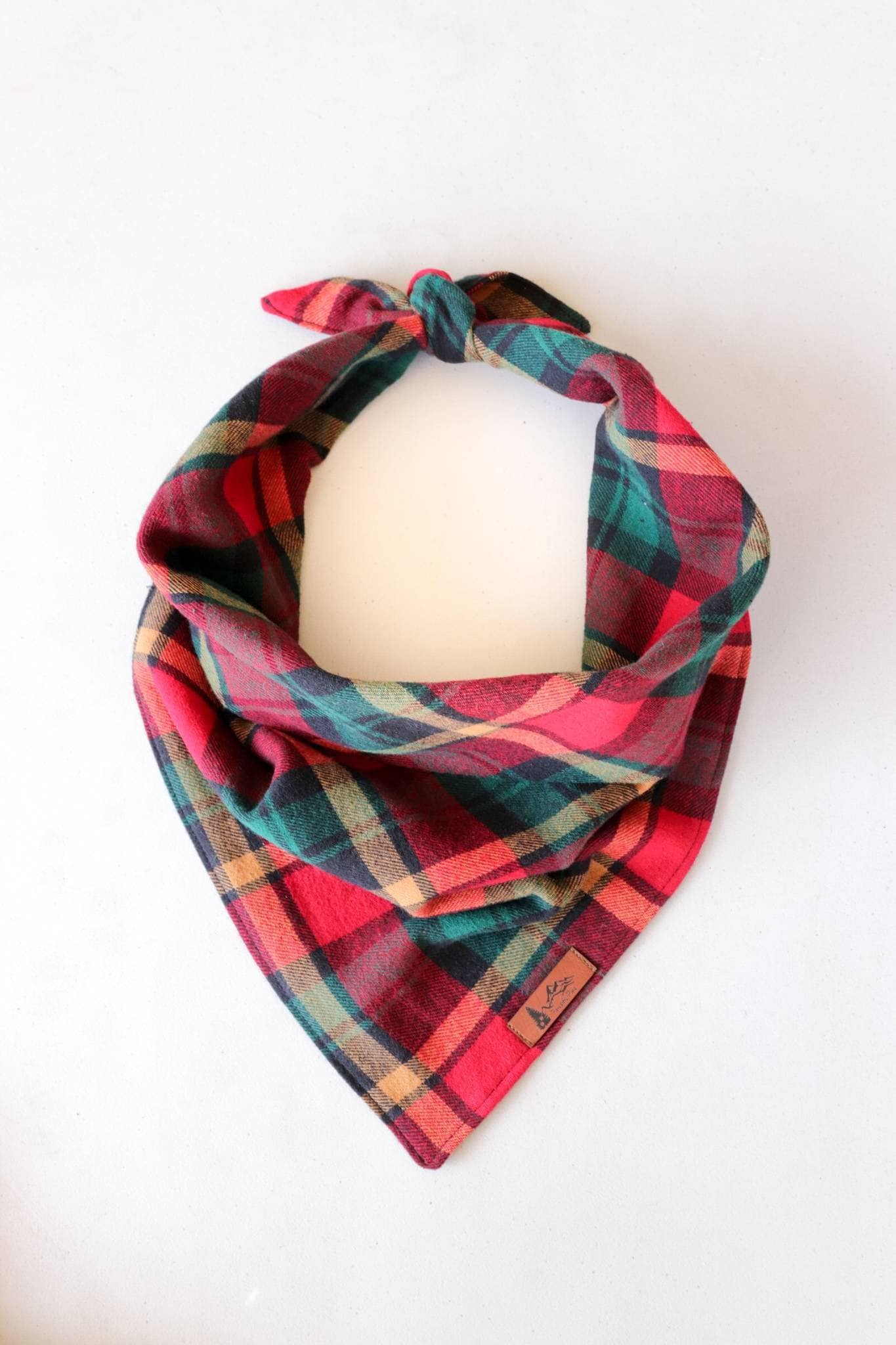 》The "Lamona" Dog bandana is a Red, Gold and Green cotton flannel plaid. This a folded and sewn self lined triangle tie on style bandana. This bandana is meant to be be folded down for the best fit and look. Made from 100% preshrunk yarn dyed cotton. Hand washing in cool water and laying flat to dry is recommended. Iron as needed.