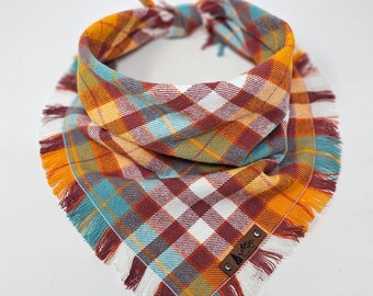 Pet Bandana "Northwest" Orange, Navy and Green plaid with BoHo Frayed Edges cotton Dog Neckwear Cat accessory